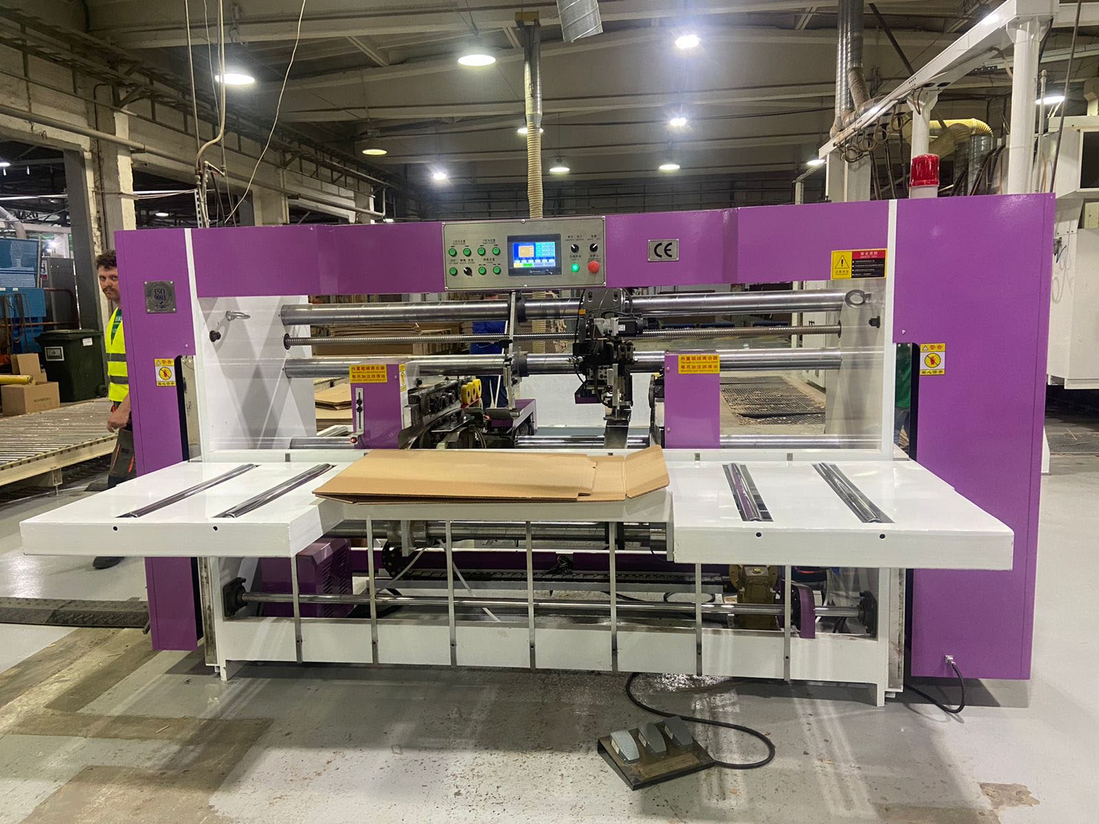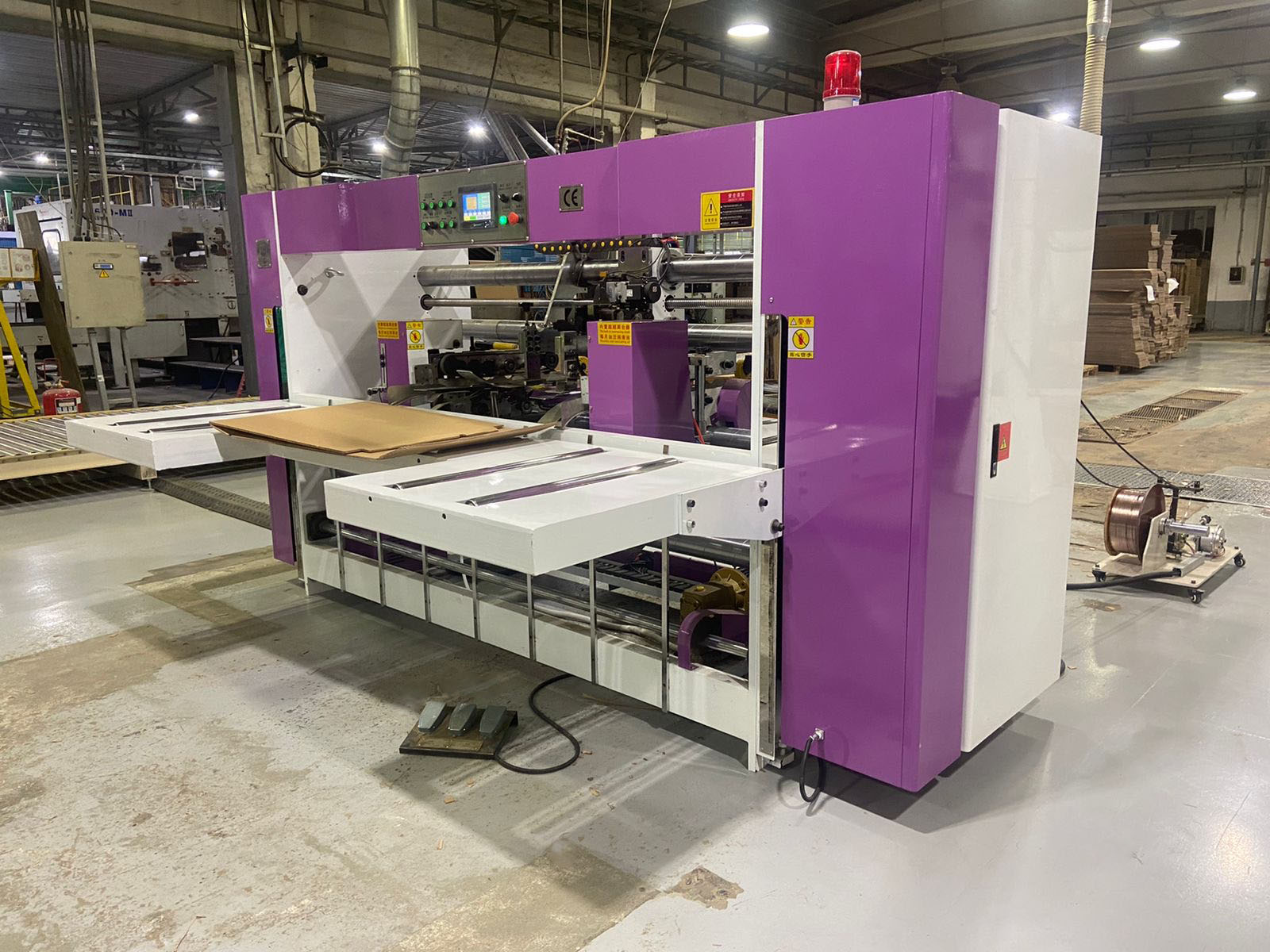 Сдвоенный скобосшиватель модели SDJ-2000 предназначен для сшивки четырехклапанных гофрокоробов из двух заготовок (трехслойный или пятислойный гофрокартон). Станок укомплектован гидравлическими тележками на секции подачи и листоукладчиком.